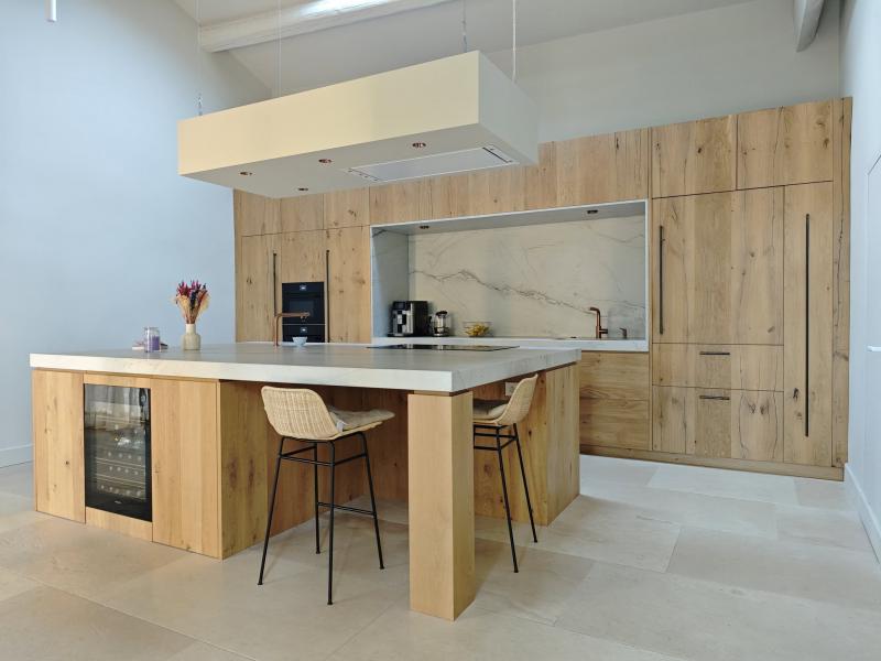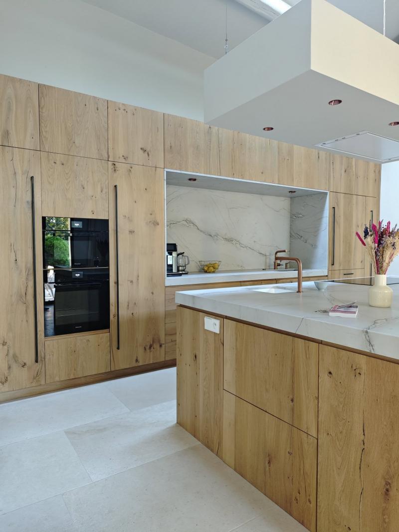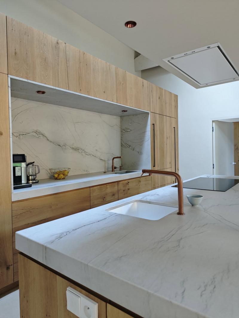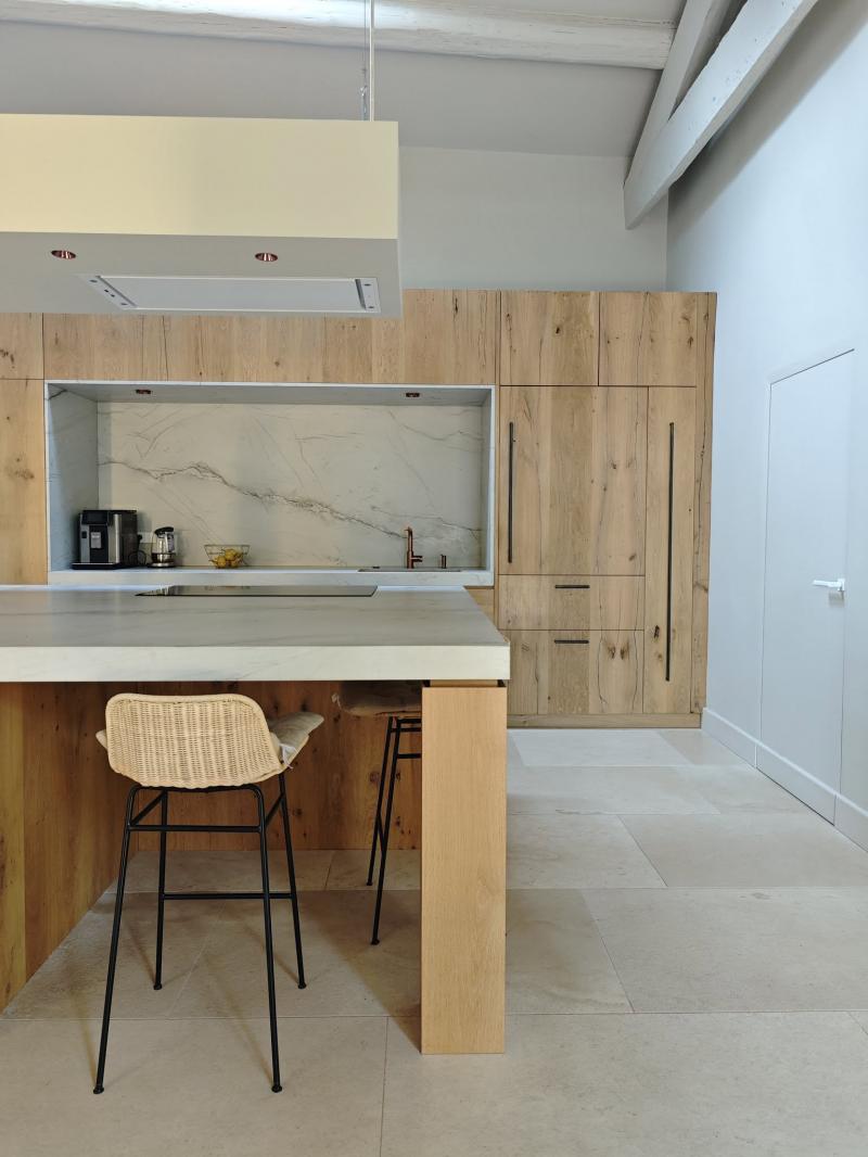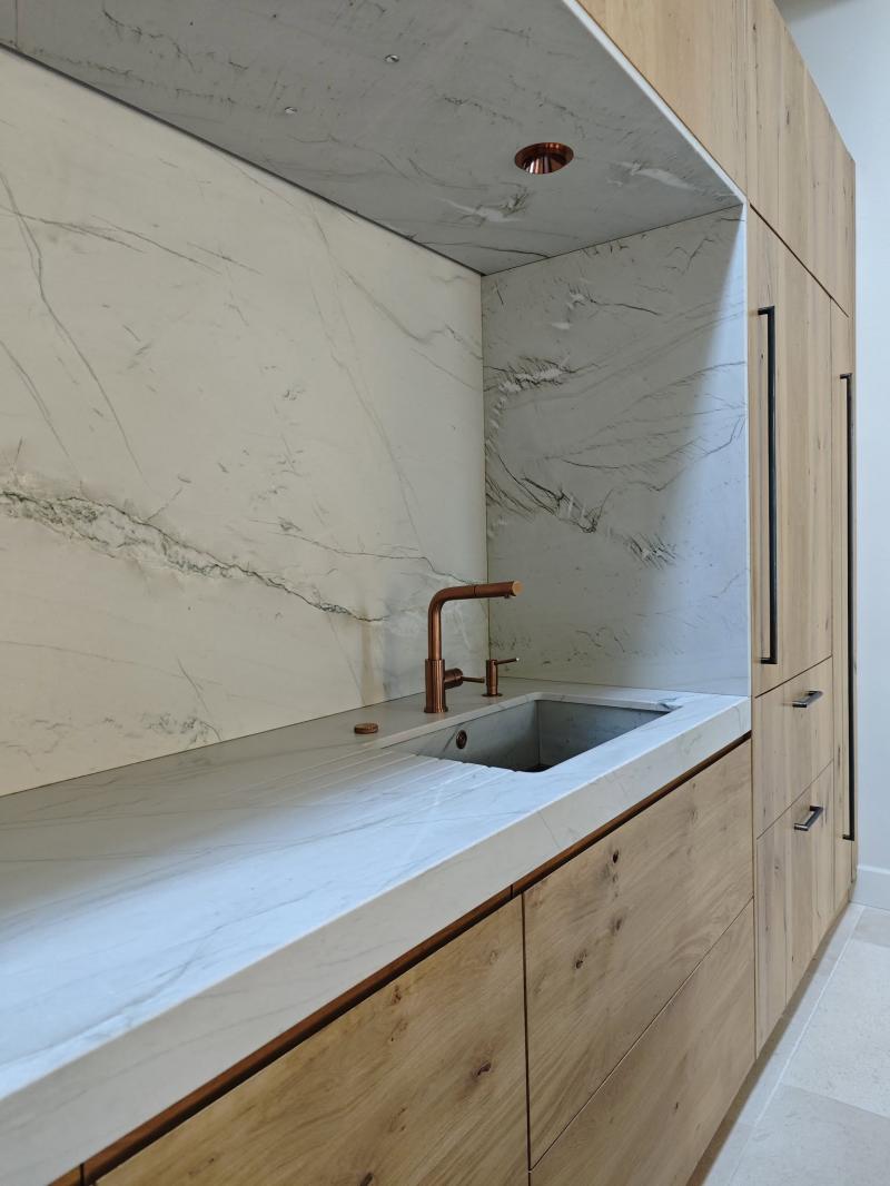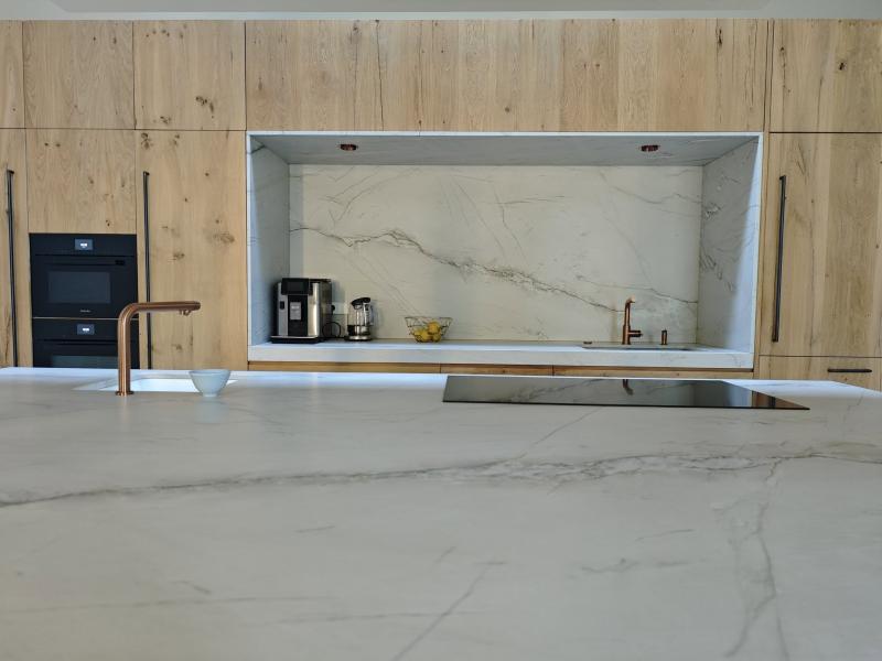 Splendide cuisine en Quartzite Calacatta Montblanc posé à L'isle sur la Sorgue dans le Vaucluse.