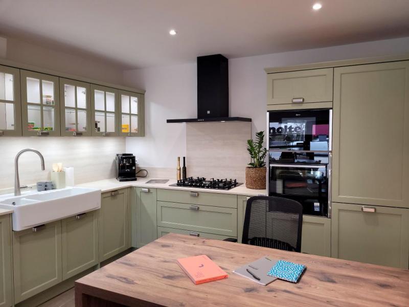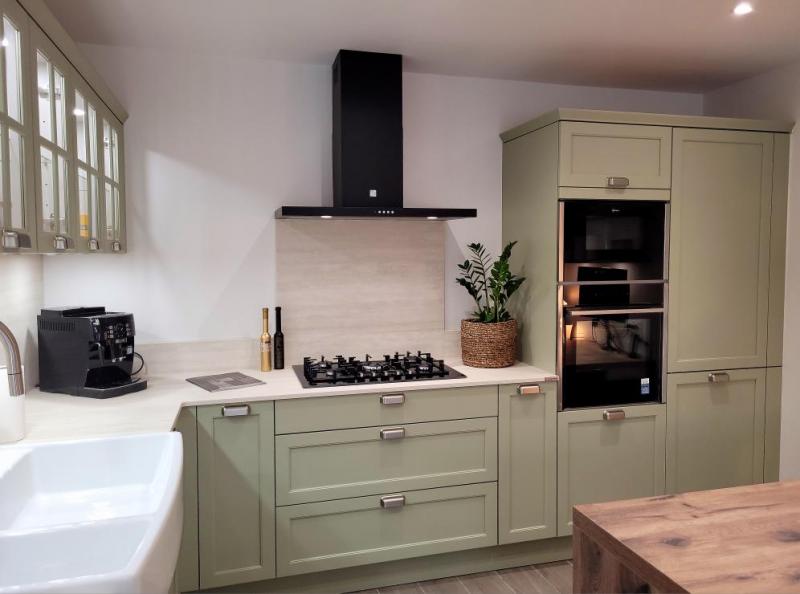 Fond de hotte et crédences entières jusqu'aux meubles hauts et à la hotte.