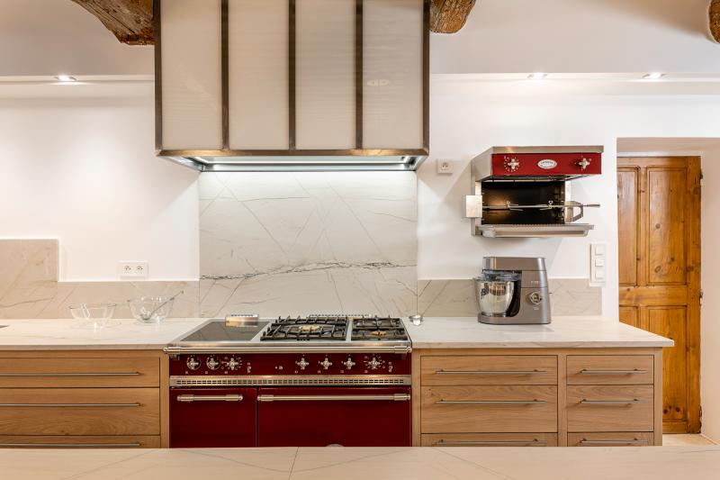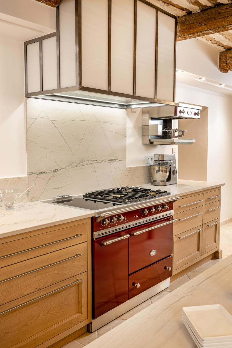 Espace cuisson équipé d'un piano avec un fond de hotte en Quartzite.