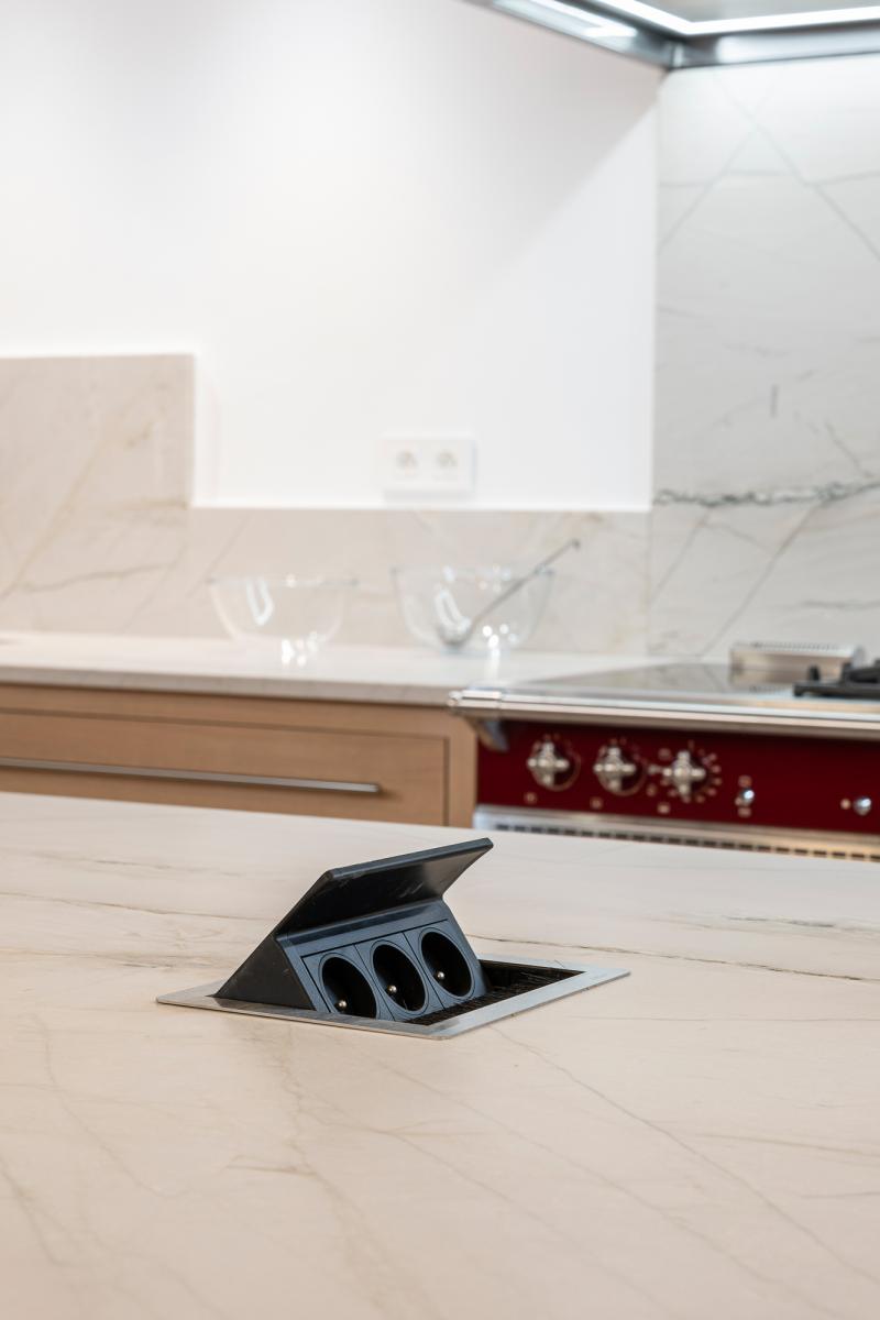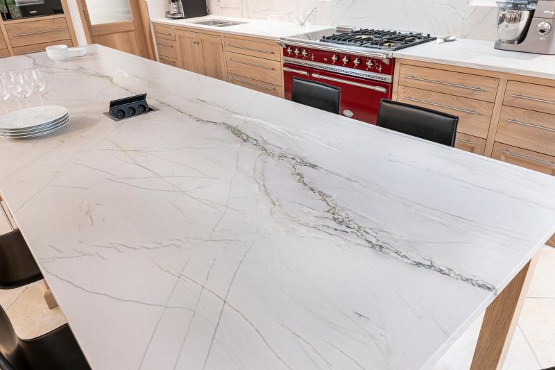 Cuisine en Quartzite cuir Calacatta Mont Blanc.