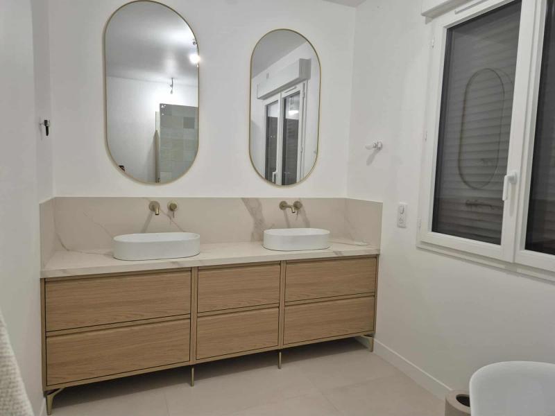Double vasque avec évier par-dessus en coupe d'onglet (fausse épaisseur) permettant une petite retombée.